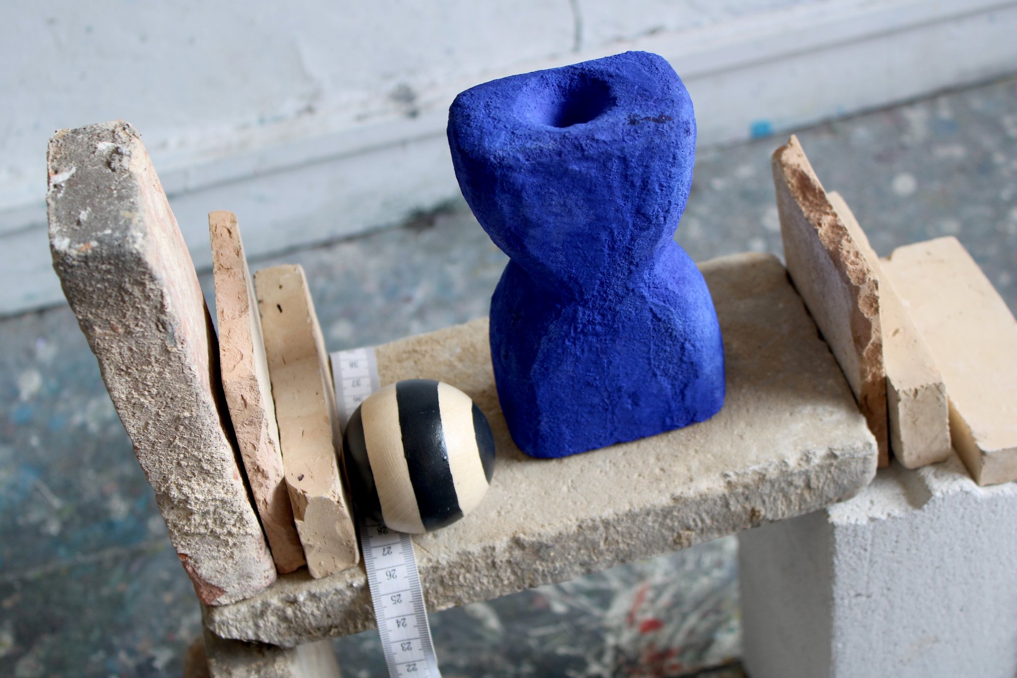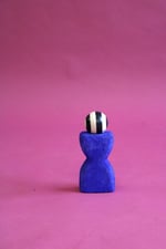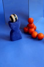 Béton, enduit minéral / pigment bleu Majorelle / vernis mat / boule en bois / peinture acrylique noire / h.15 x l.8 cm